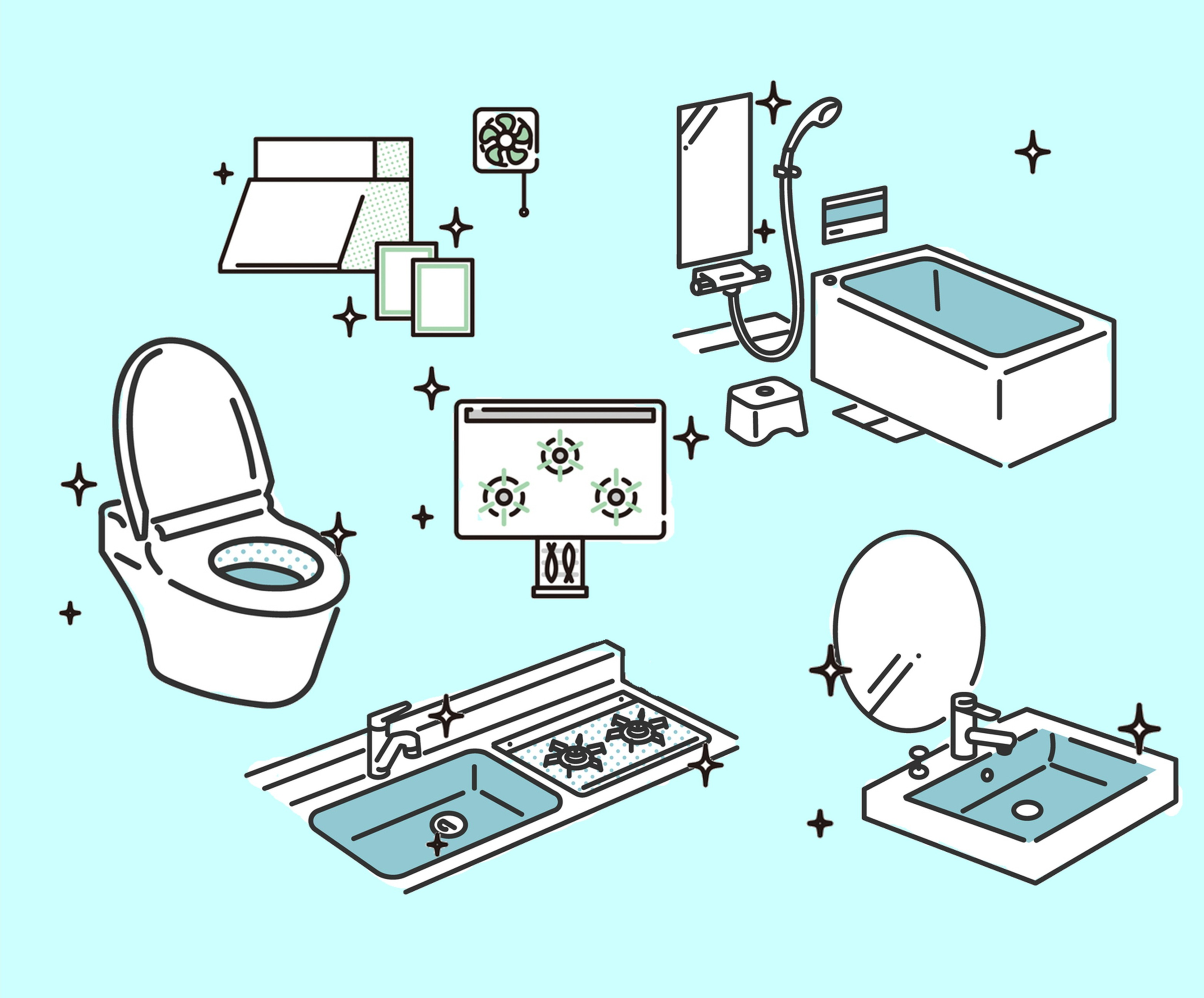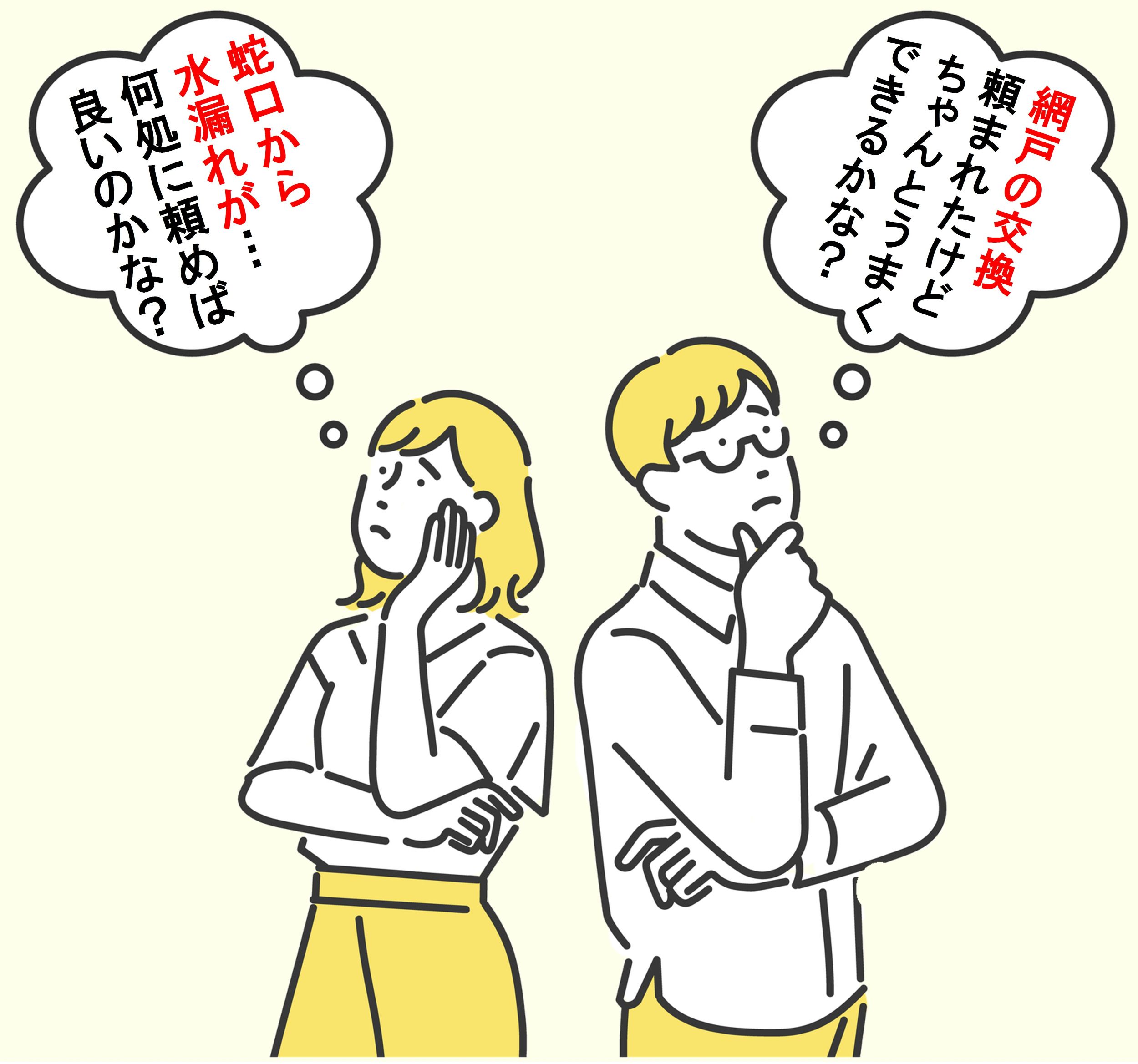水回りや、電気関係すべて、テレビアンテナ工事、防犯カメラ、窓・玄関ドア・鍵・網戸の張替といった建具の事など